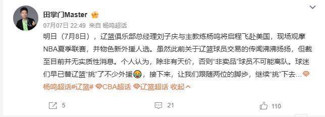 8日,辽宁男篮总经理刘子庆和主教练杨鸣启程奔赴美国,现场观摩学习 NBA 夏季联赛,为球队物色下个赛季的外援人选。与此同时助理教练乌戈也早已经抵达,他将加盟NBA骑士教练组学习,参与夏季联赛执教,后续将回归辽篮执教,之前已经官宣,续约3年。