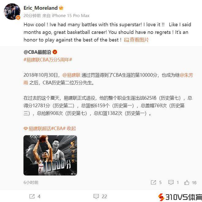 莫兰德再次致敬易建联:能和最佳中的最佳对立过是种光荣
