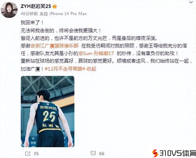 赛后,赵岩昊发文说道:我回来了!无法将我击倒的,终将会使我更弱小!催促人行进的,也许不是前方的万丈光芒,而是身后的暗夜深渊。