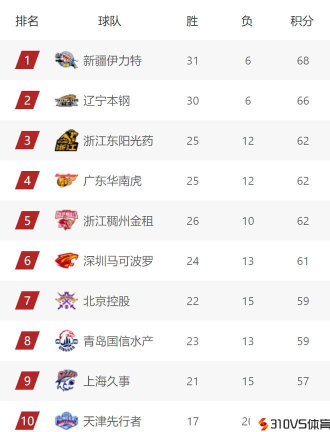 CBA惯例赛积分榜(截至1月31日)