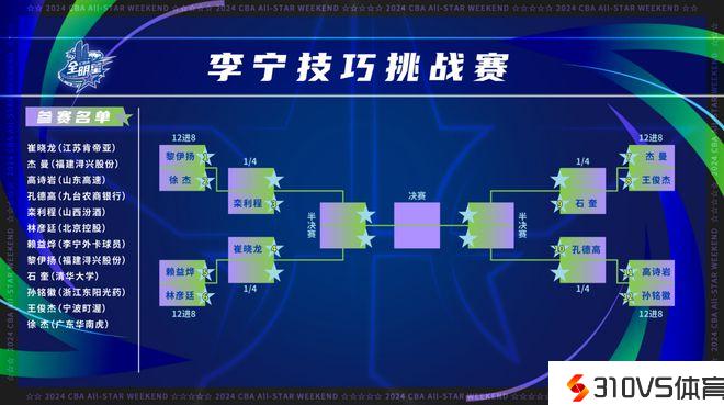 预赛分12进8、8进4两轮,预赛晋级前四的球员,将于3月3日全明星赛中场,争夺李宁技巧应战赛冠军头衔。