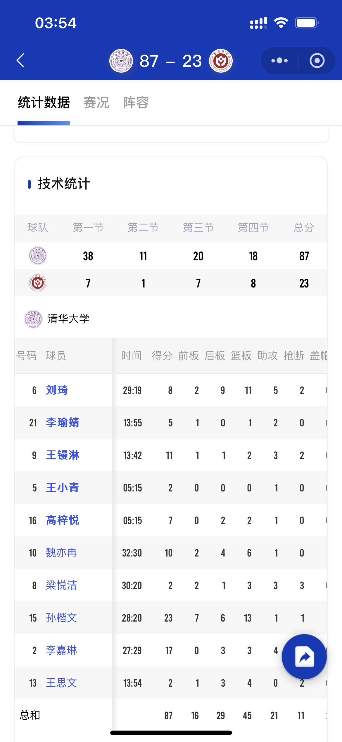易边再战,清华队在第三节又重新找回状态,第三节比赛,他们单节拿下20分,打出一波20-7的小高潮,双方的分差被进一步拉开。而在进入末节比赛,虽然清华队开始收敛,进攻端稍微收手,不过,无奈两队的差距确实太大了。即便清华队不尽全力打,山西队也无力追赶。整个第四节比赛,清华队又打了一波18-8的小高潮,最终帮助球队以64分的巨大优势击败对手。