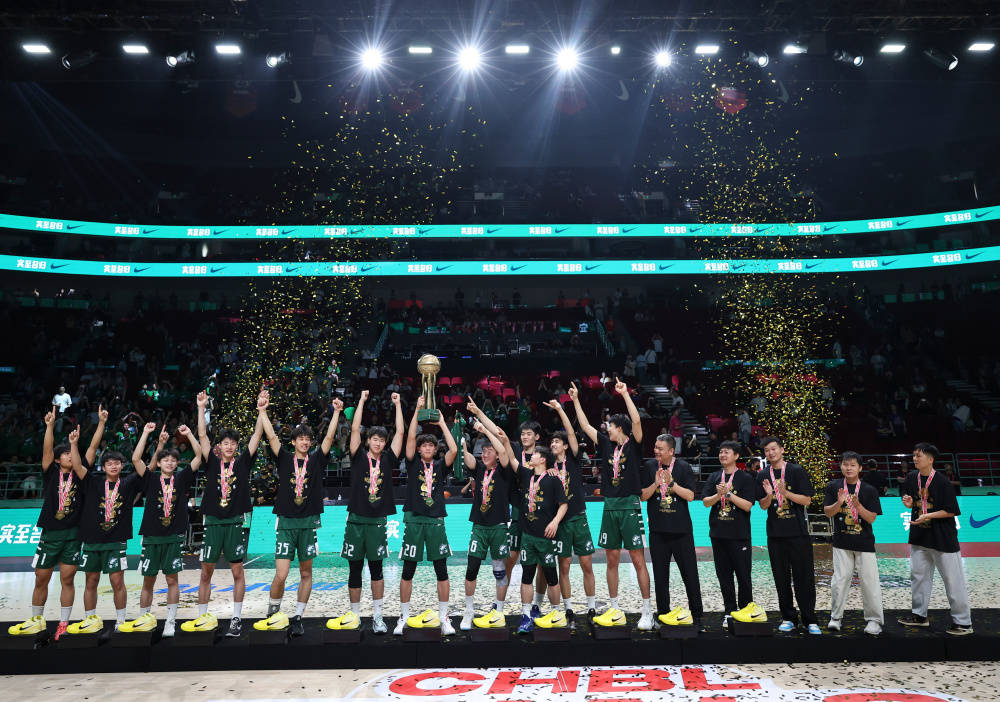 5月25日,在2024-2025赛季耐克中国高中篮球联赛全国总决赛中,广东实验中学队在颁奖仪式上庆祝夺冠。新华社记者 雒圆 摄