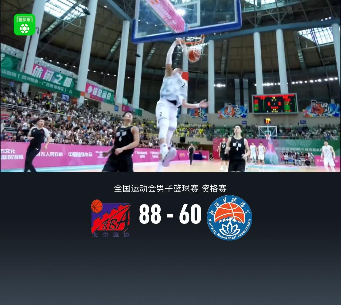 北京时间6月8日全国运动会男子篮球赛 资格赛,北京男篮对阵新疆男篮。半场北京男篮51-26新疆男篮,最终北京男篮88-60新疆男篮。