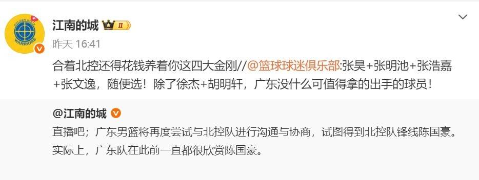 媒体人江南的城对于广东队交易陈国豪非常感兴趣,他连续回复网络上的评论。有位球迷写道:“张昊+张明池+张浩嘉+张文逸,随便选!除了徐杰+胡明轩,广东没什么可值得拿的出手的球员。”