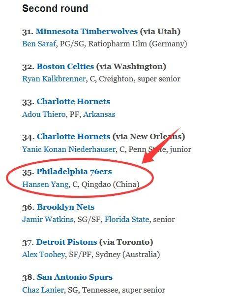 美国权威媒体ESPN更新了25届模拟选秀排名,预测杨瀚森次轮总第35顺位被费城拿下,相较上一期次轮总第41顺位被勇士选中,上升6名。