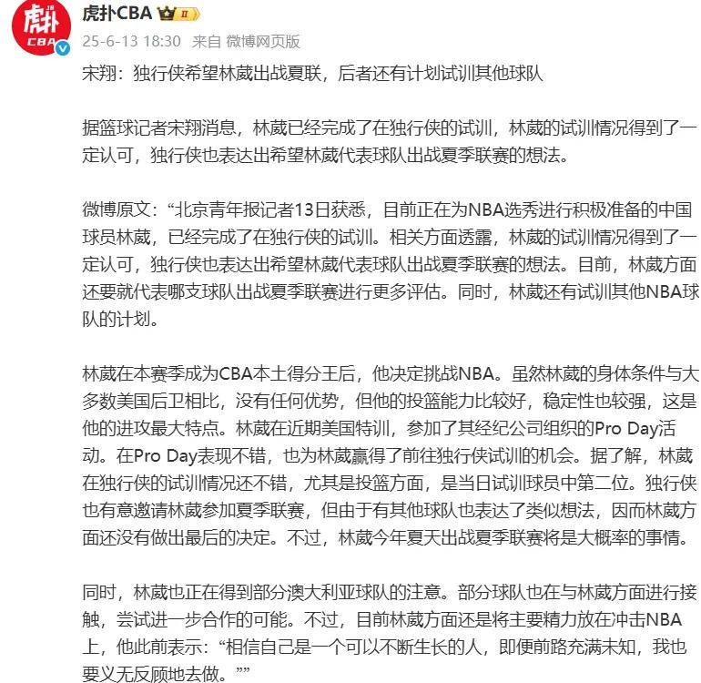 不仅独行侠,其他NBA球队也有着邀请林葳征战夏联的兴趣,于是他需进一步进行综合考虑后才能做出最终决定。