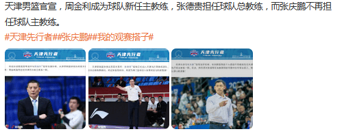 北京时间6月20日,根据天津男篮官方社交媒体公示,经俱乐部与张庆鹏指导友好协商,张庆鹏指导因个人原因不再继续担任天津先行者主教练一职。