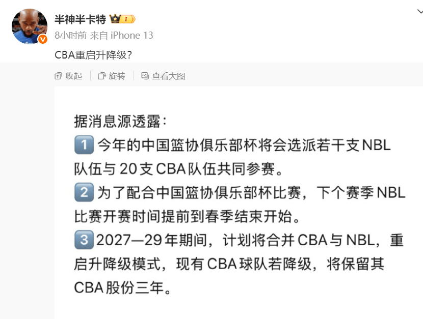 根据知情人士透露,CBA将有望在2027-29年期间,与NBL完成合并。在两大联赛合并以后,CBA将再度重启升降级模式,届时CBA战绩欠佳的球队,将存在被降级的可能,而NBL球队则有了升级的机会。这一点,既可以刺激一下CBA的躺平族,像辽篮苦主四川队,江苏队这些球队,常年混迹乐透区。又给了NBL球队冲击CBA的机会,完全是一举两得,利大于弊的事情。而对于被降级的CBA球队,CBA方面将保留其三年的CBA股权。