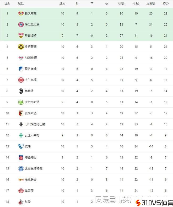 德甲最新积分榜:拜仁客场4球大胜多特,勒沃库森2分优势领跑!