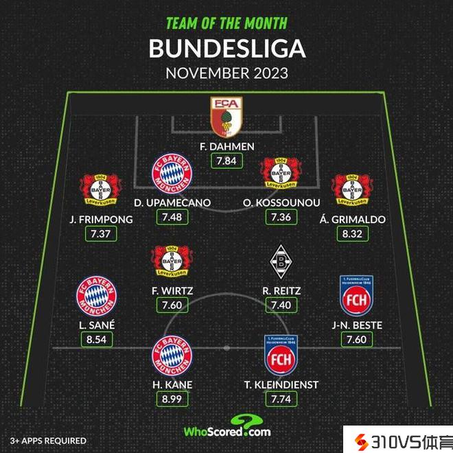 WhoScored德甲11月最佳阵:凯恩、维尔茨领衔,药厂4人中选