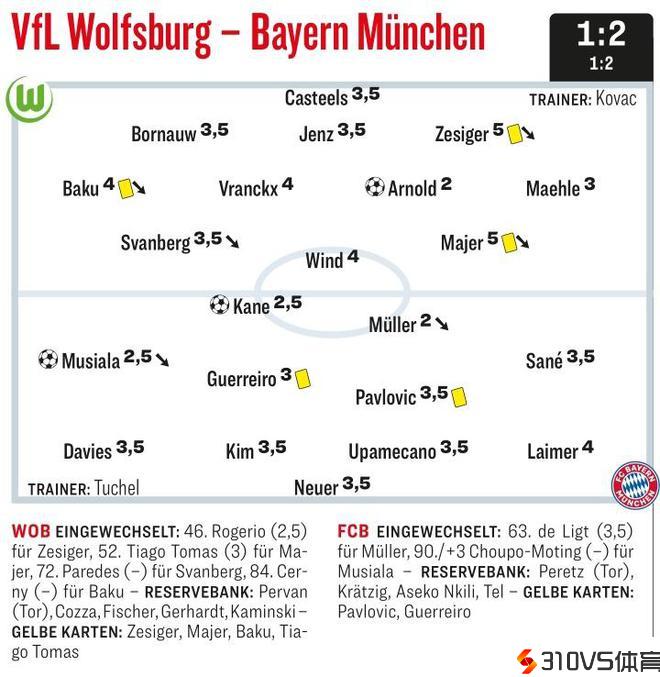 沃尔夫斯堡vs拜仁踢球者评分
