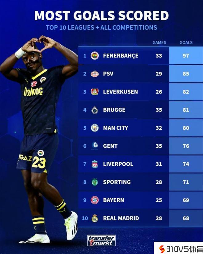 主流联赛球队进球榜:费内巴切97球居首,药厂第3&曼城第5