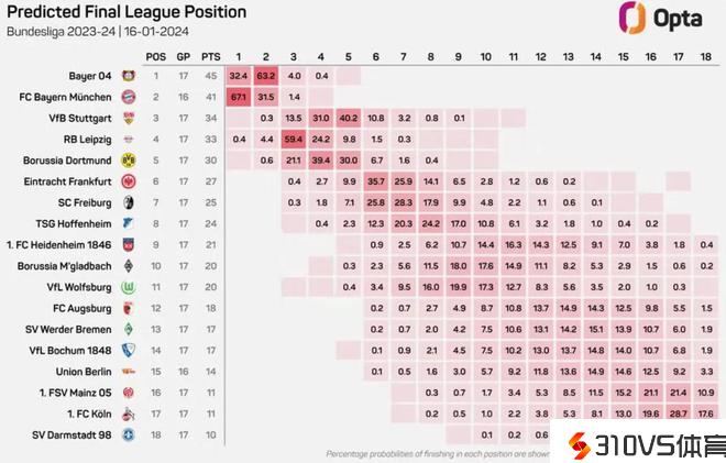 Opta德甲本赛季夺冠概率:拜仁67.1%遥遥抢先,勒沃库森仅32.4%