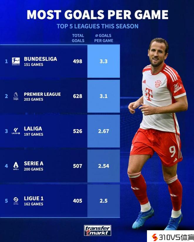 本赛季五大联赛场均进球榜:德甲3.3球居首,英超次席&西甲第三