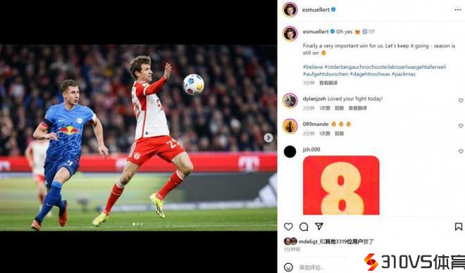 本场竞赛穆勒首发退场,赛后他也在社媒晒出本场照片,配文写道:“太棒了!终于收获一场重要的成功。让我们继续坚持胜势,赛季还没有完毕!”