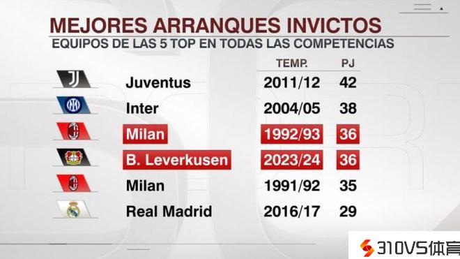 勒沃库森赛季残局36场不败追平92-93米兰,距离尤文纪录差6场