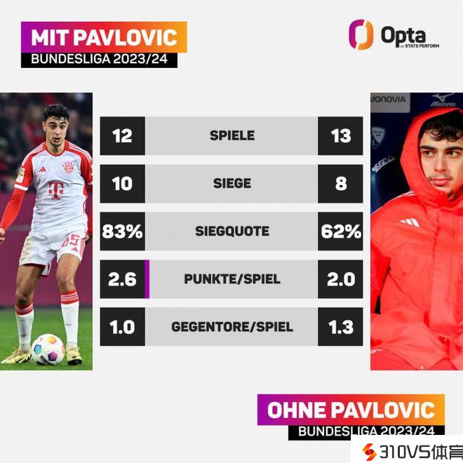帕夫洛维奇上场拜仁德甲场均取得2.6分,未上场拜仁场均仅获2分