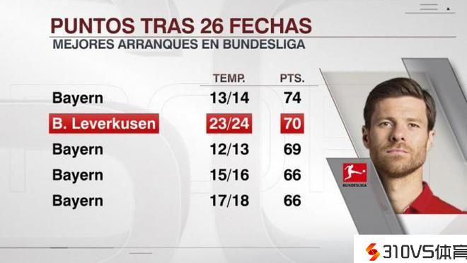 勒沃库森26轮拿到70分,德甲历史同期第二高&仅次于13-14拜仁