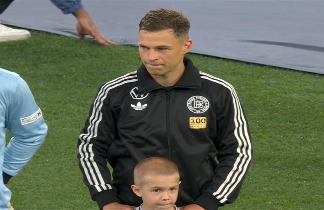 对阵葡萄牙的比赛,基米希作为队长首发出战,迎来代表德国国家队第100次出场的里程碑之战。赛前球员通道里,基米希牵着自己的儿子一起入场。