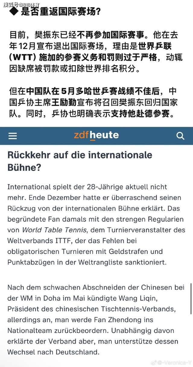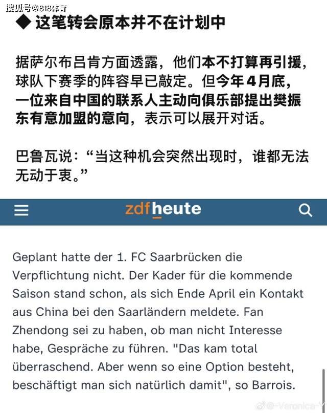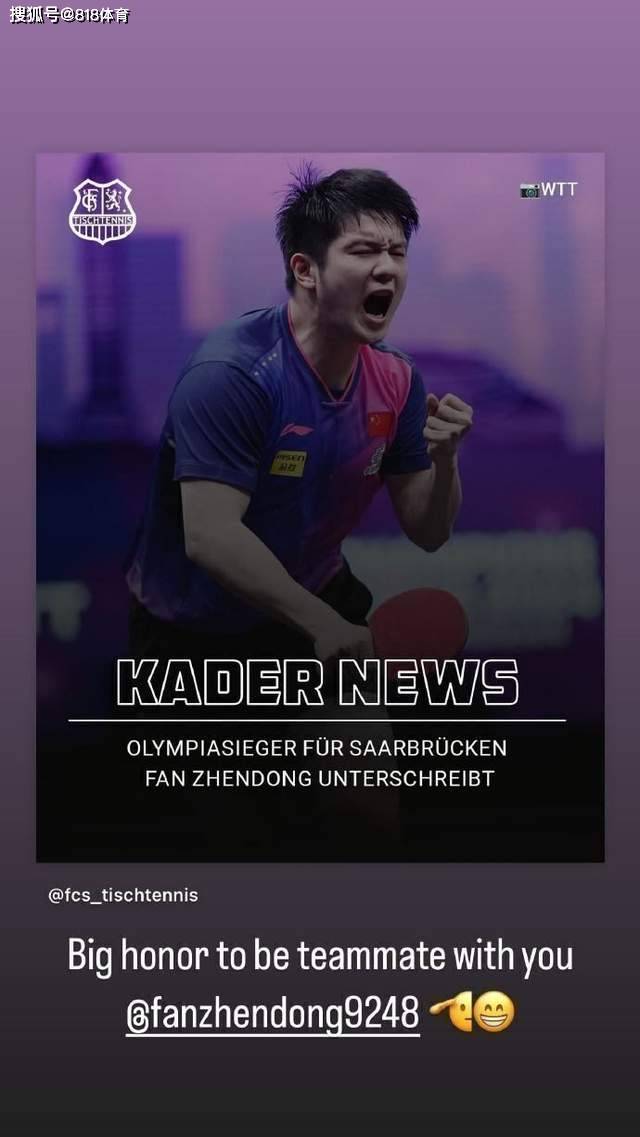 据德国媒体德国电视二台ZDFheute报道,萨尔布吕肯俱乐部原本不打算再引援,因为新赛季阵容已基本确定,直到4月底,一位来自中国的联系人突然主动向俱乐部提出,樊振东有加盟的意愿,询问俱乐部是否有兴趣展开对话。