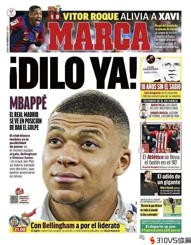马卡报在接到了队伍“外部人士”传递的音讯后,十分自信的对外发文宣布,“姆巴佩曾经决议了未来”,且“他会在很快的时间内对外官宣”。假设他们说的是真的,那么就会给转会窗扔下一枚价值庞大炸弹。