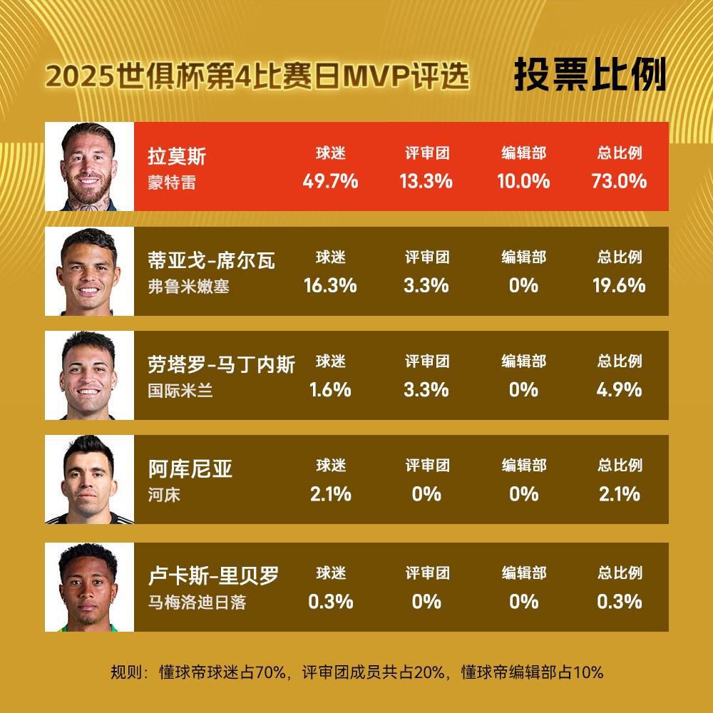 球迷朋友们大家好,欢迎来到懂球帝X咪咕2025世俱杯每日MVP评选。2025世俱杯第4个比赛日MVP得主出炉,39岁的传奇中卫、效力于蒙特雷的老将拉莫斯高票当选!