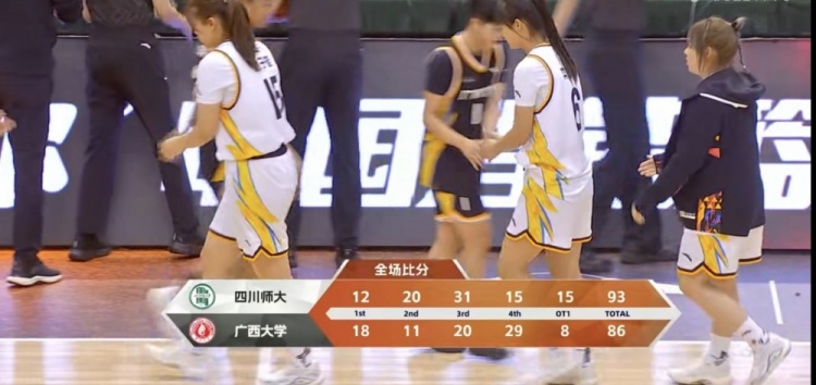 加时赛,张潇文里突外投带领四川师大9-2再次建立主动权,江欣补篮止血,张潇文补篮也能回应,四川师大保持着两球以上领先,黄妍涵三罚仅一中,最终四川师大加时93-86力克广西大学,晋级8强。