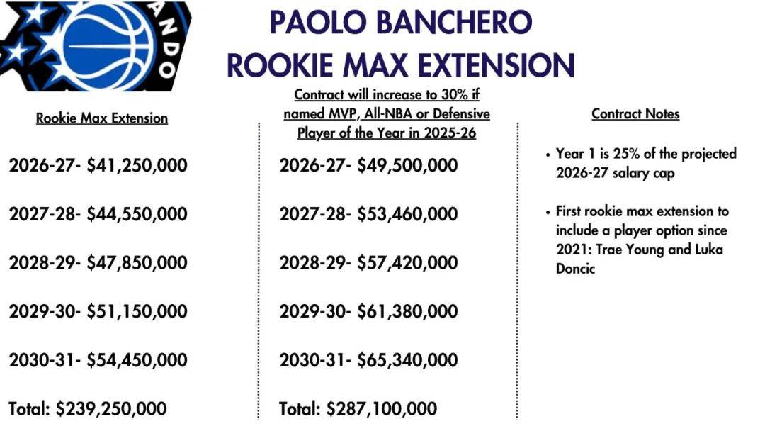 对班凯罗说,MVP和DPOY遥不可及,更现实的是冲击最佳阵容,哪怕入选三阵,也能拿到2.87亿。续约合同从2026-27赛季开始执行,2031年夏天到期。下面这张图是年薪对比,当班凯罗拿到2.87亿时,他的起薪为4950万美元。