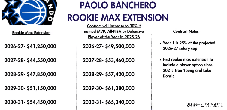 随后,NBA薪金专家Marks公布了班凯罗未来5年的具体薪水——基础薪资为5年2.39亿:首赛季2026-27赛季为4125万、最后一个赛季2030-31赛季则为5445万;若班凯罗在2025-26赛季当选MVP、入选最佳阵容或获得最佳防守球员,合同将自动升级至5年2.87亿美金。