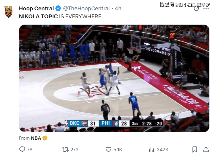 美媒HC也晒出托皮奇在抢断后个人推进快攻,最终空接助飞队友。