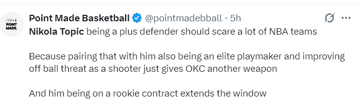 美媒:托皮奇是一名出色的防守球员,他已经让众多NBA球队感到恐惧,他能完美结合组织进攻与防守,当他持球进攻时威胁非常大,雷霆又得到一件有力武器,而且他只是新秀合同第二年。
