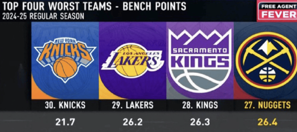 湖人上赛季替补得分,场均26.2分,排在联盟倒数第二,仅好过于尼克斯的场均21.7分。增加替补席的进攻能力仍需湖人管理层动动脑筋。