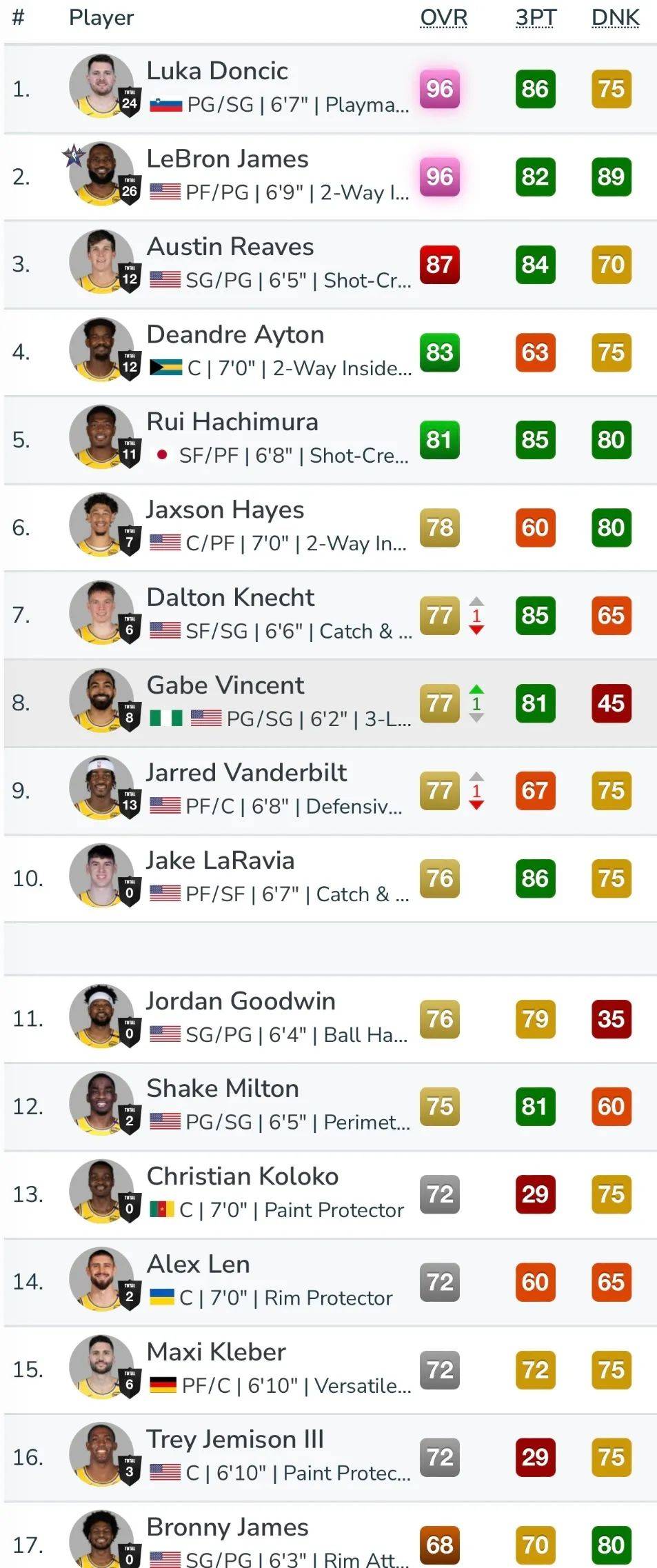 今日,NBA2K游戏官方公布了湖人球员艾顿的形象,他的能力值83,排在队内第四。拉拉维亚的能力值为76,排在队内第10。第一是东契奇詹姆斯的96。