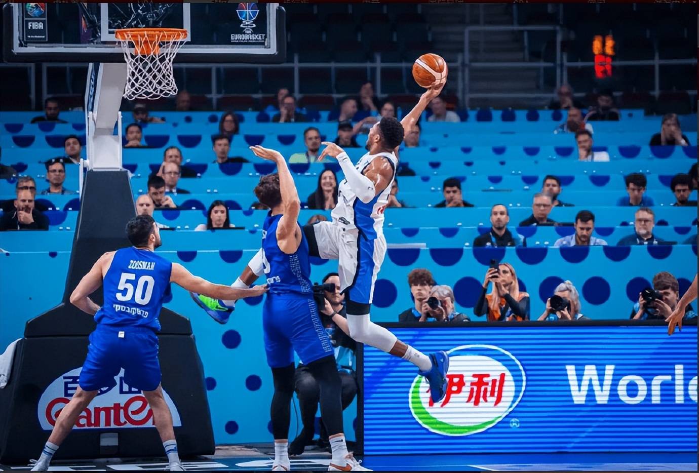 当时比赛最后以色列队没有放弃,他们只落后了6分还在强攻,结果字母哥上演精彩的连续防守回合。先是在时间还剩下14.5秒的时候,以色列队强攻被字母哥送上一个单手的遮天大血帽,单臂把对手给摁了下来,这个球防完之后,接下来字母哥在时间来到12.7秒的时候,站在三秒区里面又完成了一次协防。
