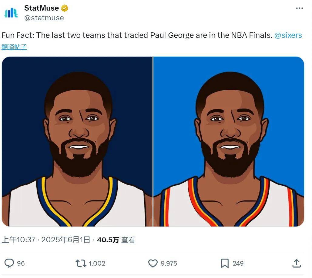 北京时间6月1日,步行者4-2淘汰尼克斯,与雷霆会师总决赛。知名媒体露天看台(Bleacher Report)赛后晒图:保罗-乔治缔造了今年的NBA总决赛。数据媒体StatMuse写道:最近两支交易保罗-乔治的球队,都进了今年的总决赛。