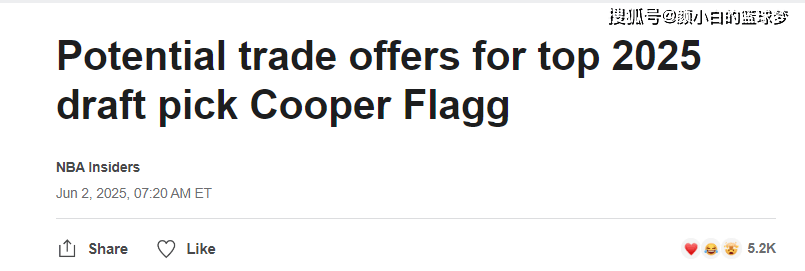 这篇推文是ESPN专栏作家扎克-克拉姆所写,他的建议是马刺用:2025年榜眼签、2025年14号签、2027年老鹰首轮签、2030年独行侠首轮互换权(还给独行侠),换来独行侠2025年状元签。马刺用状元签选中弗拉格搭档文班亚马。