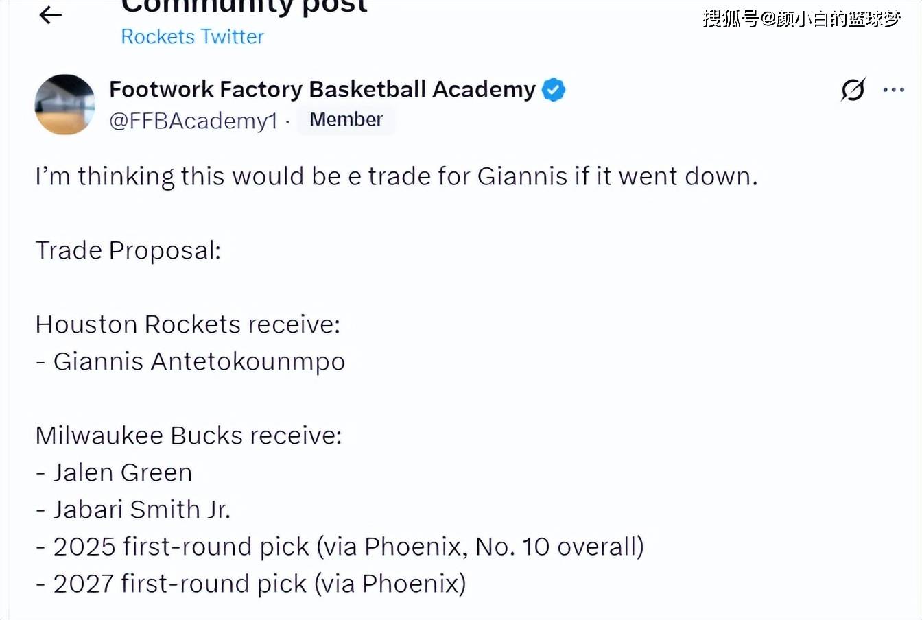 那么按照 克里斯-曼尼克斯的说法,最符合火箭预期的交易方案就出炉了,美媒FFBA模拟的这套方案——火箭送出杰伦-格林、小贾巴里-史密斯、2025年10号签、2027年太阳不保护首轮换扬尼斯。