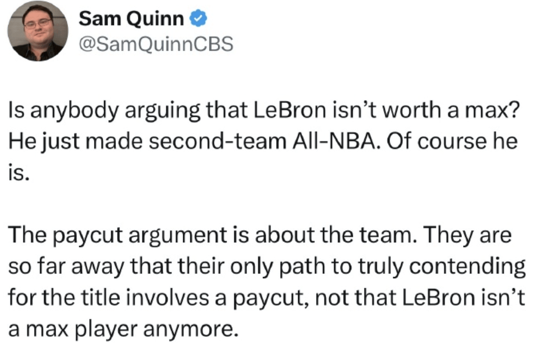 今日,CBS记者Sam Quinn发推表示:“难道还有人质疑勒布朗不值得顶薪吗?他刚入选了最佳阵容二阵,当然配得上顶薪。关于降薪的讨论本质是球队问题——湖人离争冠水准差距太大,他们争夺冠军的唯一出路需要勒布朗降薪,而非因为他不再是顶薪级球员。”