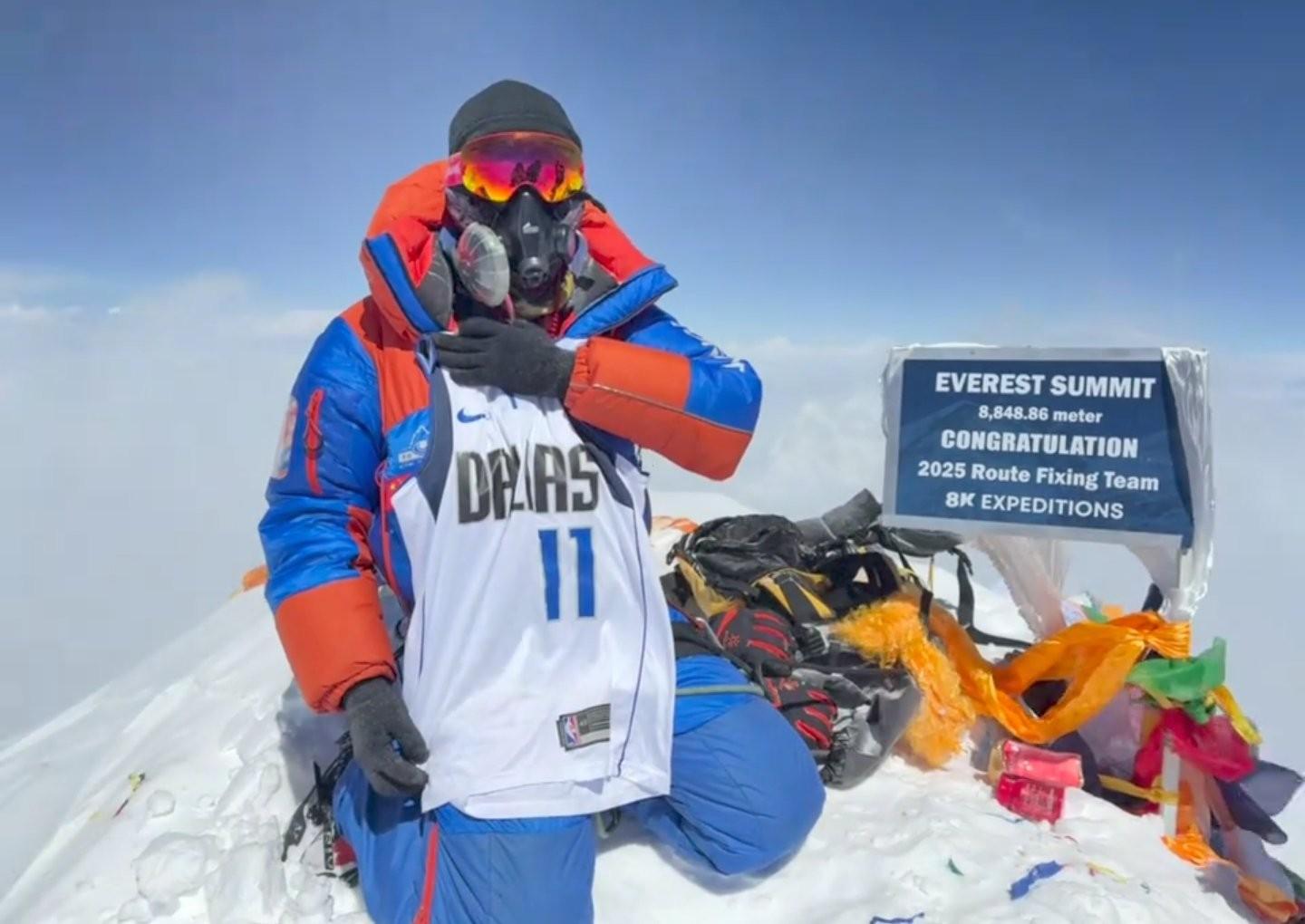近日,一名中国球迷身着凯里-欧文球衣登顶珠穆朗玛峰,并在社媒分享了登顶照片。