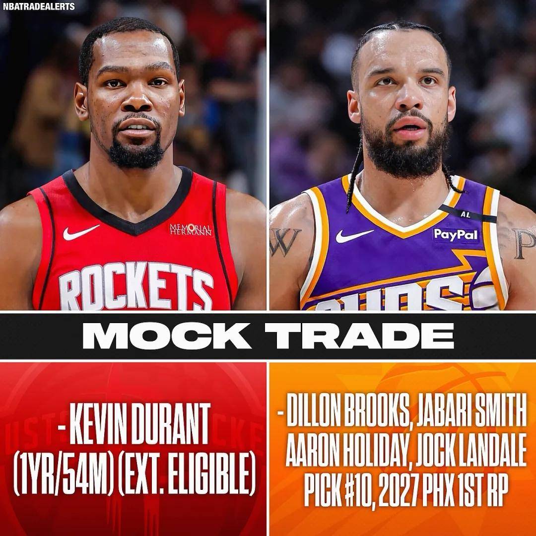前两天一笔模拟交易:火箭送出狄龙-布鲁克斯、小贾巴里-史密斯、阿龙-霍勒迪、兰代尔、今年首轮10号签、2027年首轮签,6换1交易得到杜兰特。这个筹码不算离谱,火箭给得起,为啥要退出交易?因为火箭可选的目标太多了!