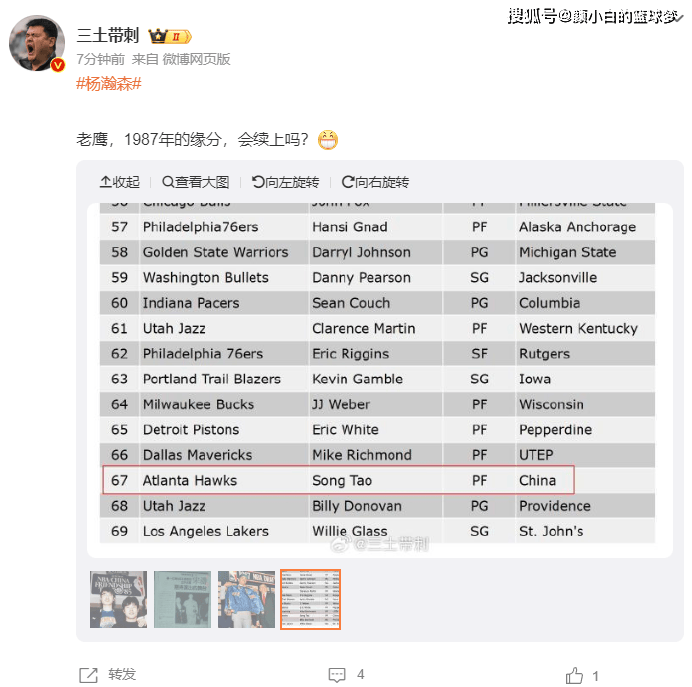 媒体人三土带刺写道:老鹰1987年的缘分会续上吗?