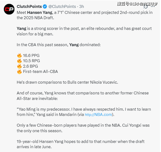 美国权威媒体Clutchpoints长文解析了2025年前100选秀球员,杨瀚森仅仅排在第46位,他们给杨瀚森的评语:预计将在次轮被选中,是一位内线得分能力出色,顶尖篮板能力,具备大个子缺席的传球视眼的球员。