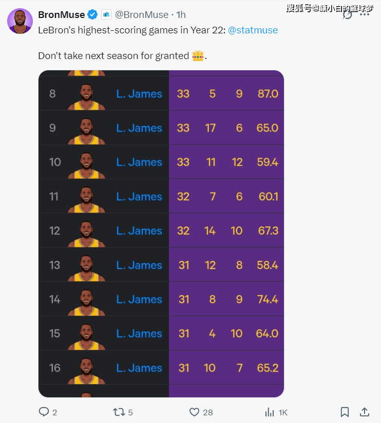 湖媒晒出勒布朗本赛季拿到30+的数据场次写道:不要把下赛季打出完美数据的勒布朗看作理所当然。