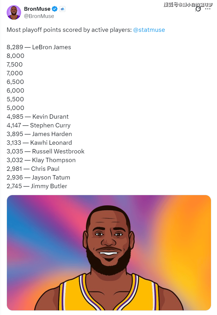 湖媒还晒出詹姆斯季后赛8289分历史第一 ,现役第二的杜兰特只有4985分。