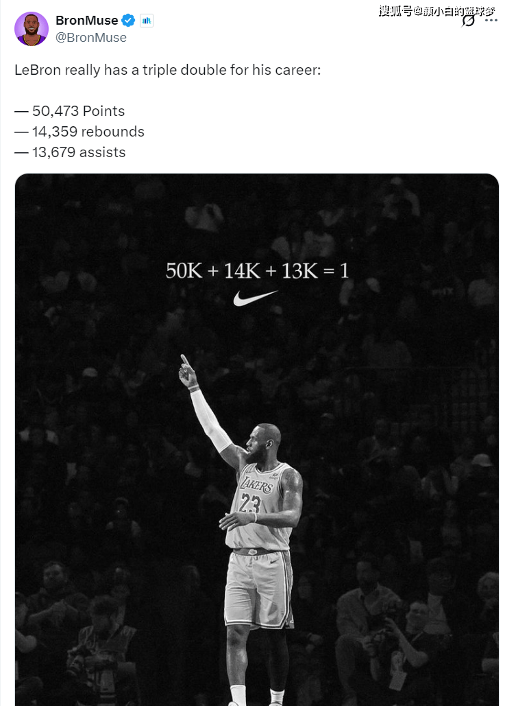 勒布朗目前已经达成50473分、14356篮板、13679助攻,他是真的完成了一个超级三双。