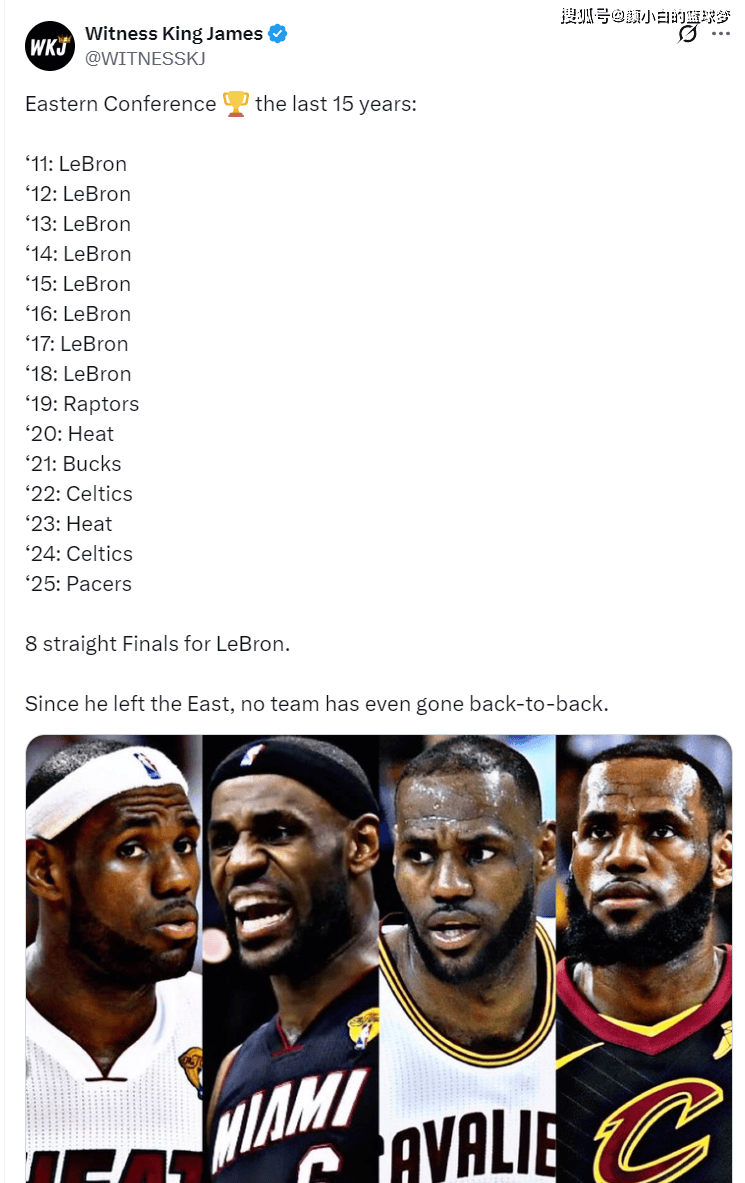 过去15年里东部冠军,勒布朗自11-18蝉联8个赛季,勒布朗西游后没有任何一支球队完成过蝉联。