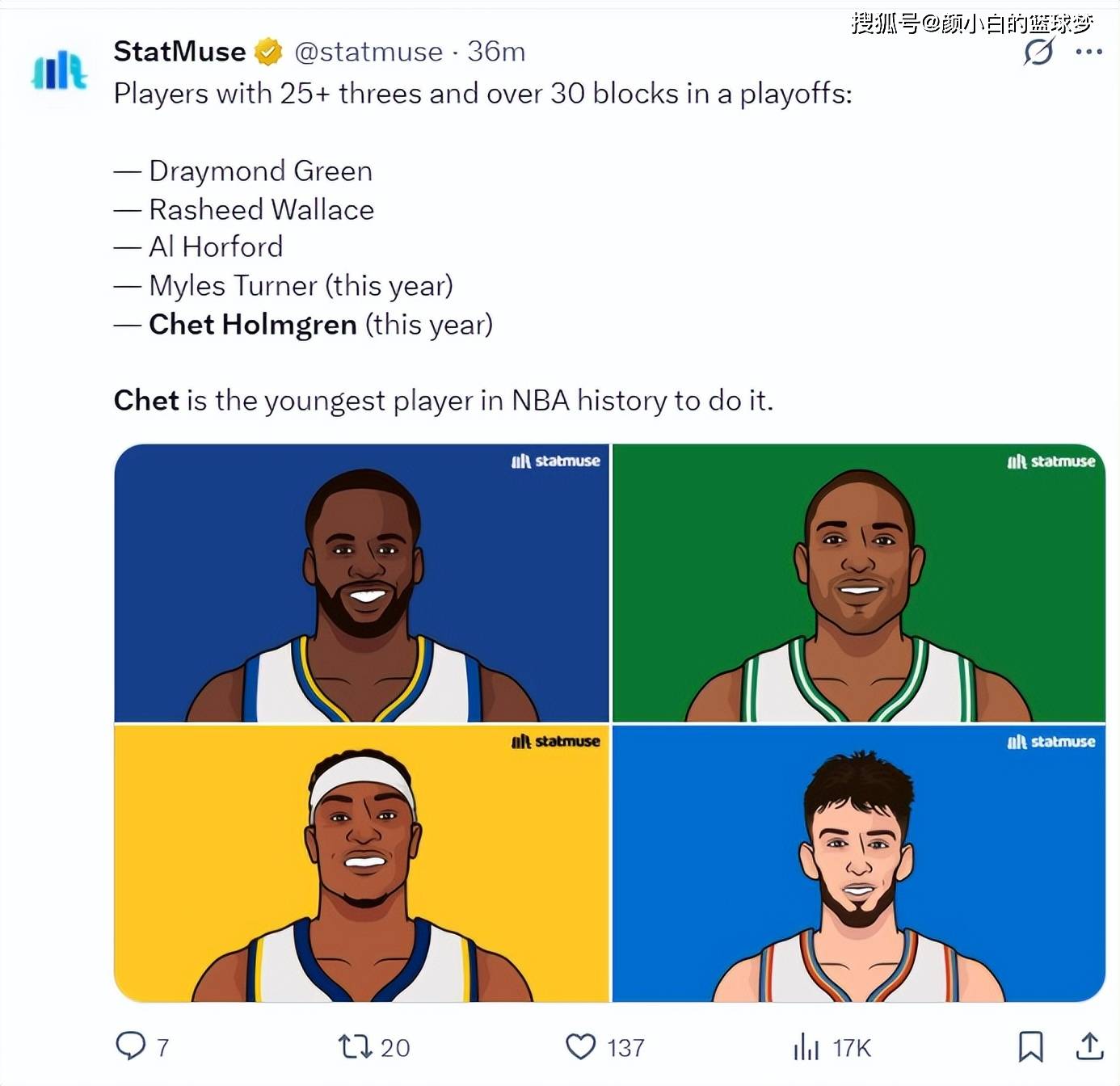 数媒:单词季后赛三分命中数超过25+且盖帽数超过30次的球员:追梦、拉希德华莱士、霍福德、特纳(今年)、霍姆格伦(今年),切特是NBA最年轻达成这一数据的球员。