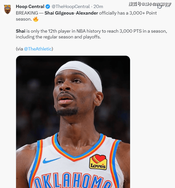 亚历山大首节5中2+三分2中1拿到6分,他凭借这6分,本赛季常规赛+季后赛合计超过3000分,他成为NBA历史第12位单赛季常规赛+季后赛达成3000分的球员。