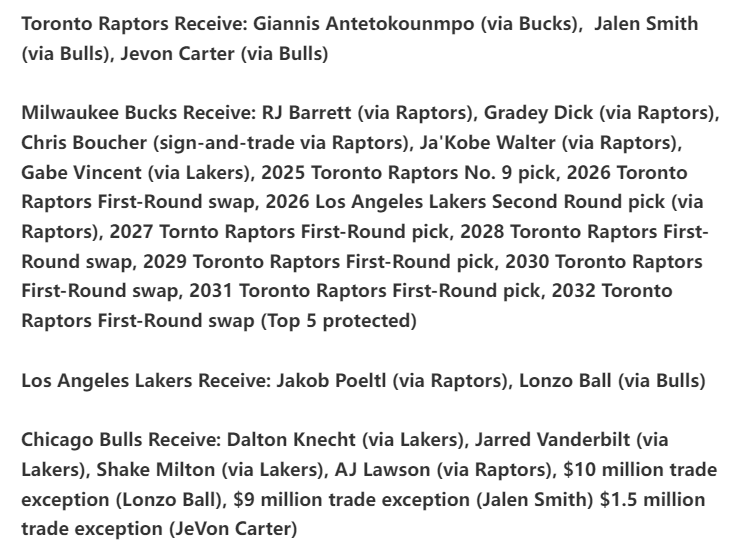 雄鹿队得到:RJ-巴雷特(猛龙)、格雷迪·迪克(猛龙)、克里斯·布歇(猛龙签约权)、贾科比·沃尔特(猛龙)、加布·文森特(湖人),以及猛龙未来8年7个首轮签(含多个互换权)和1个湖人次轮签;